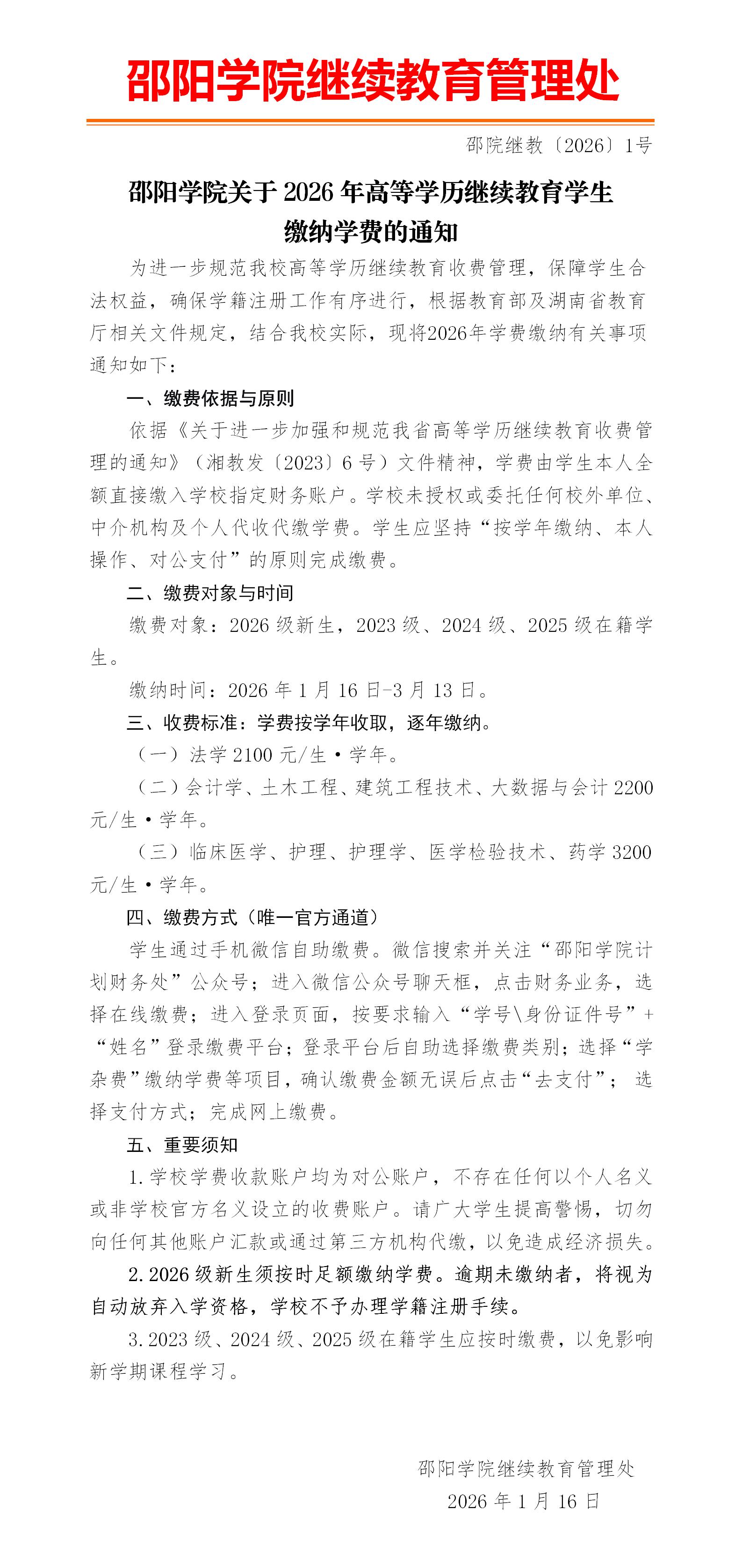 邵阳学院关于2026年高等学历继续教育学生缴纳学费的通知