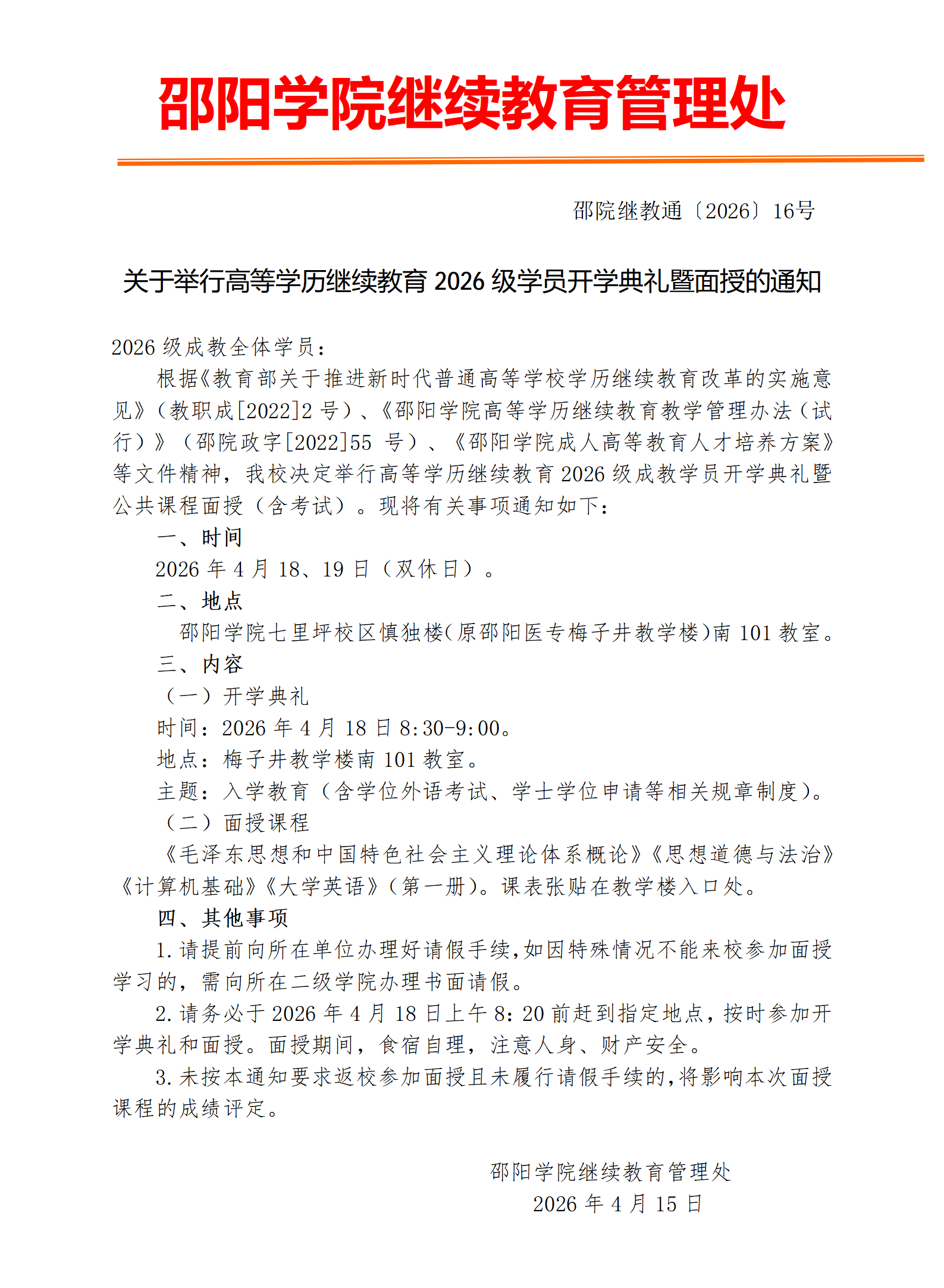 关于举行高等学历继续教育2026级学员开学典礼暨面授的通知